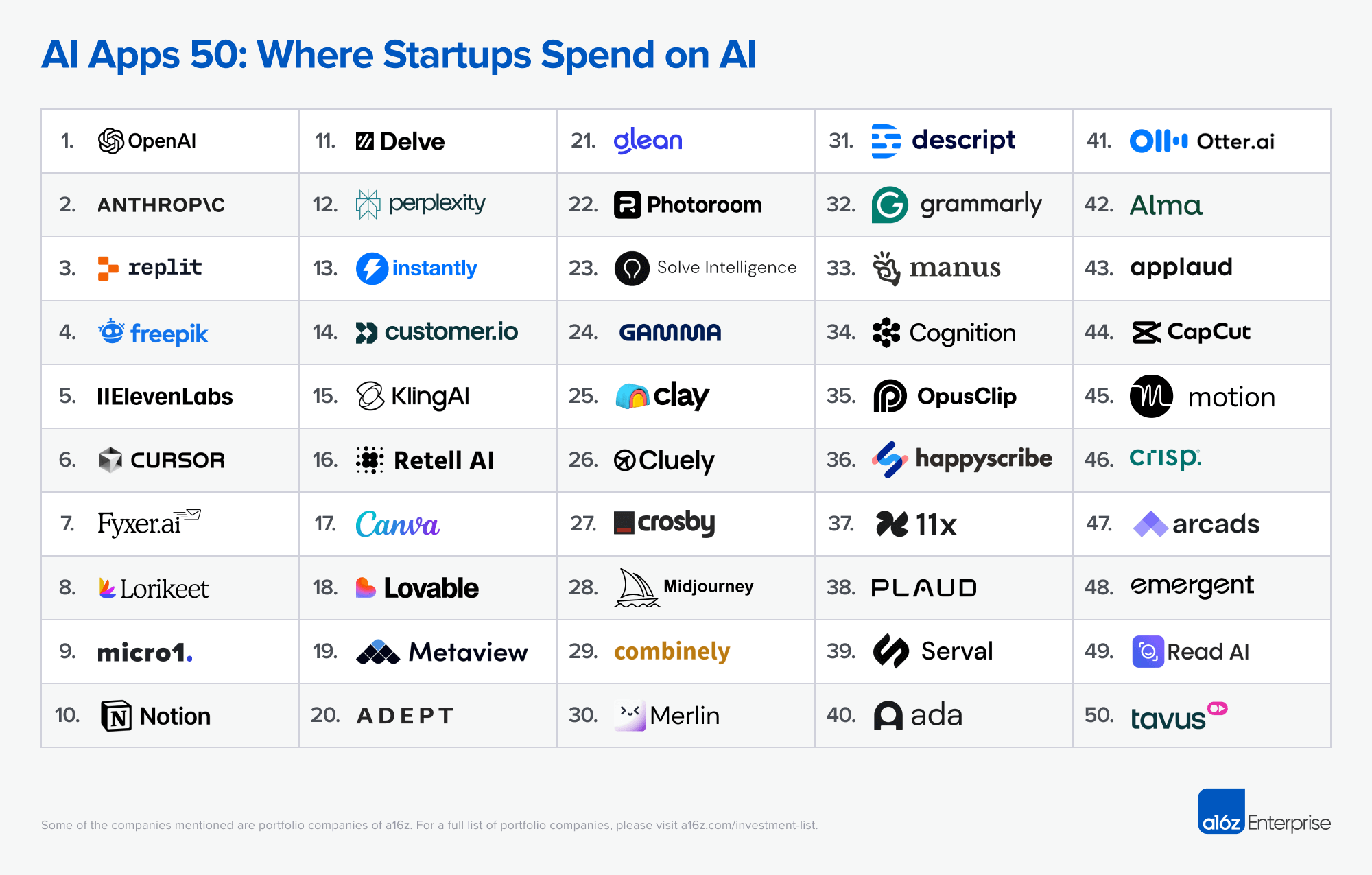 AI Apps 50: Where Startups Spend on AI (2025 Countdown)
